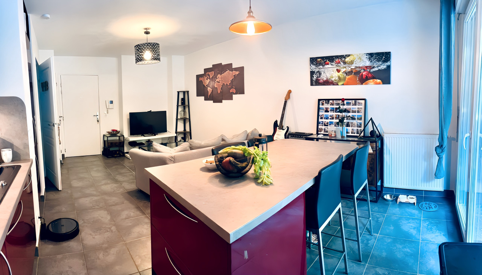 - une cuisine ouverte sur le séjour, entièrement équipée : plaque de cuisson, hotte aspirante, four électrique, réfrigérateur-congélateur, lave-vaisselle