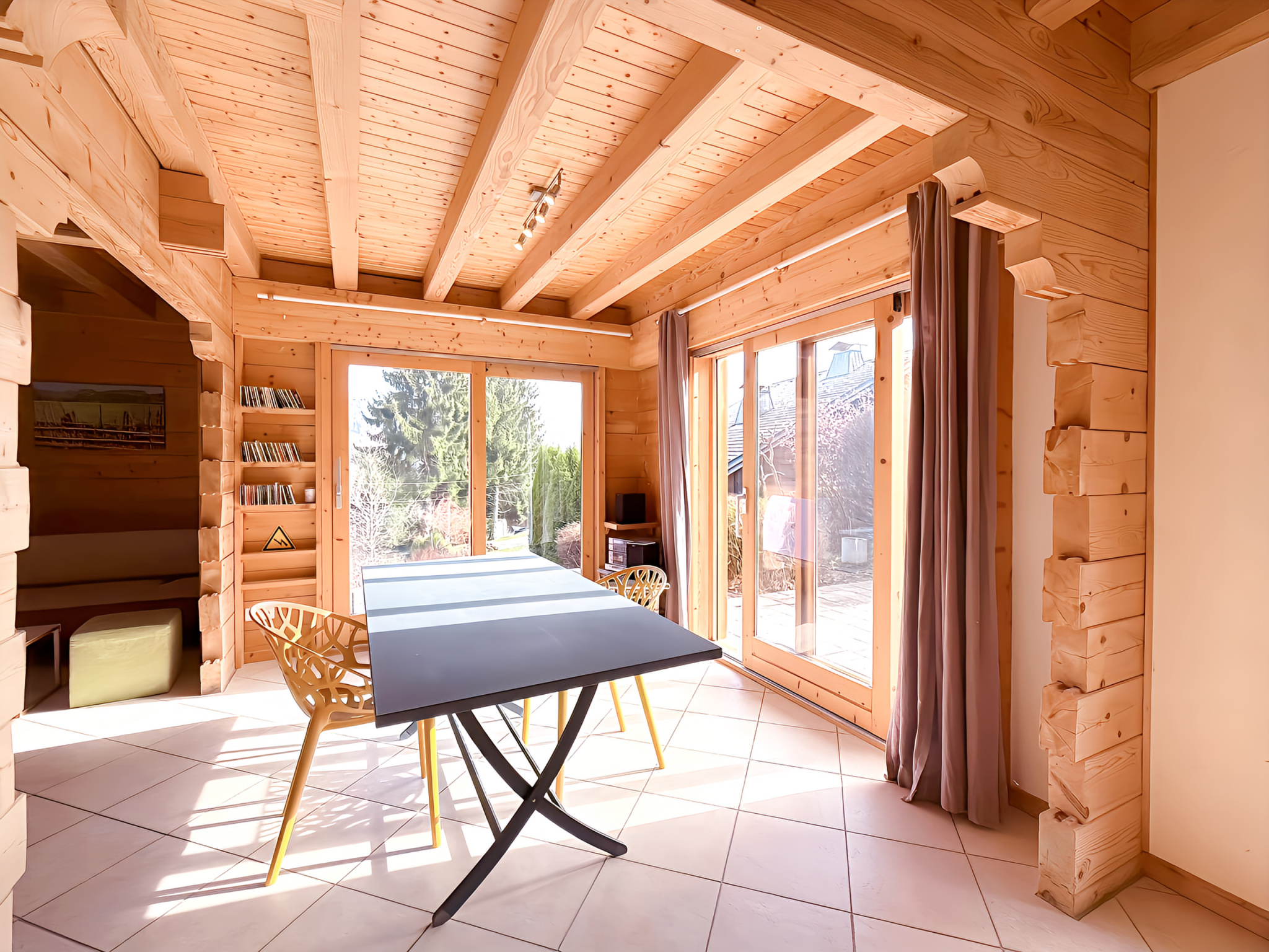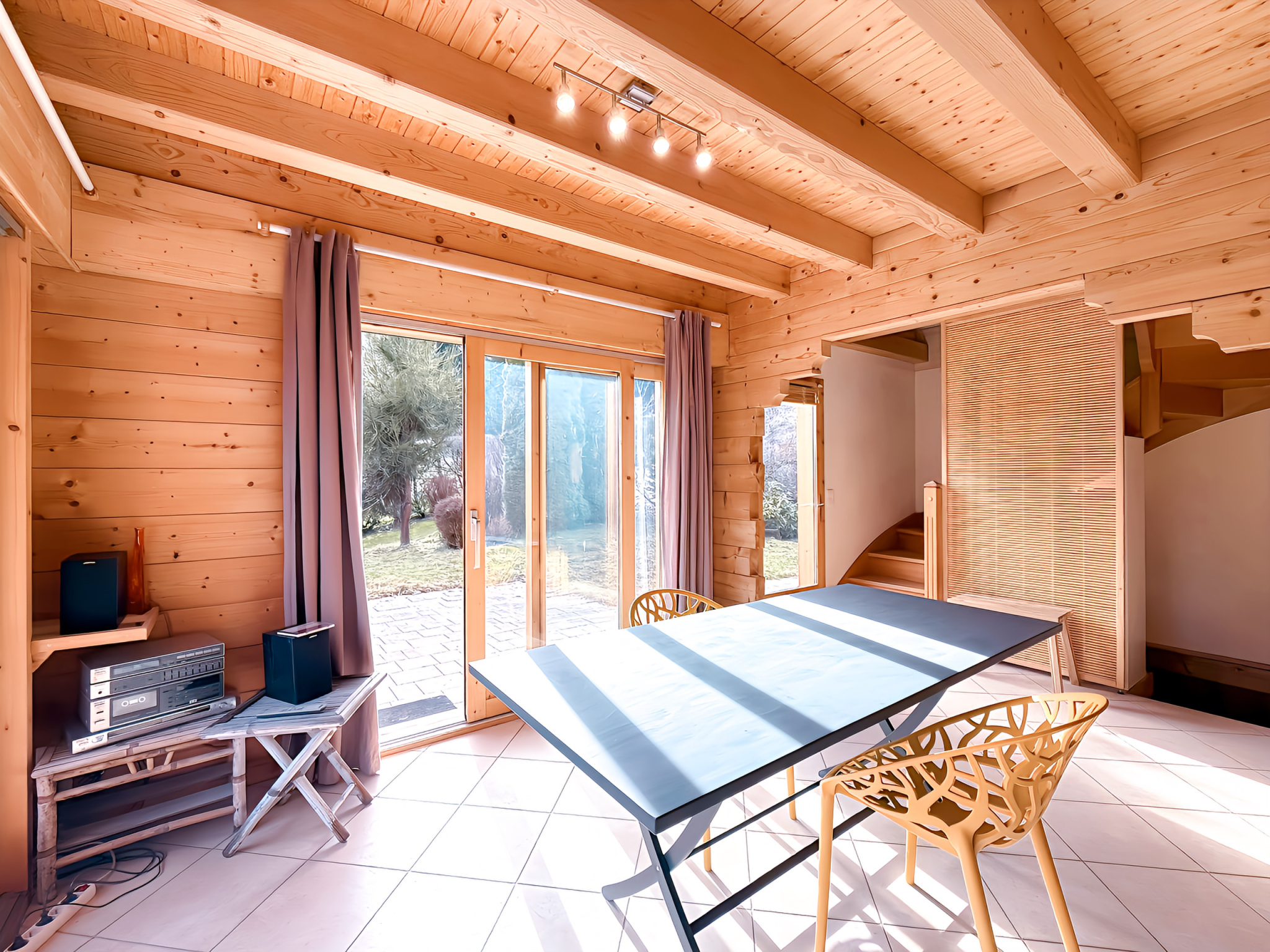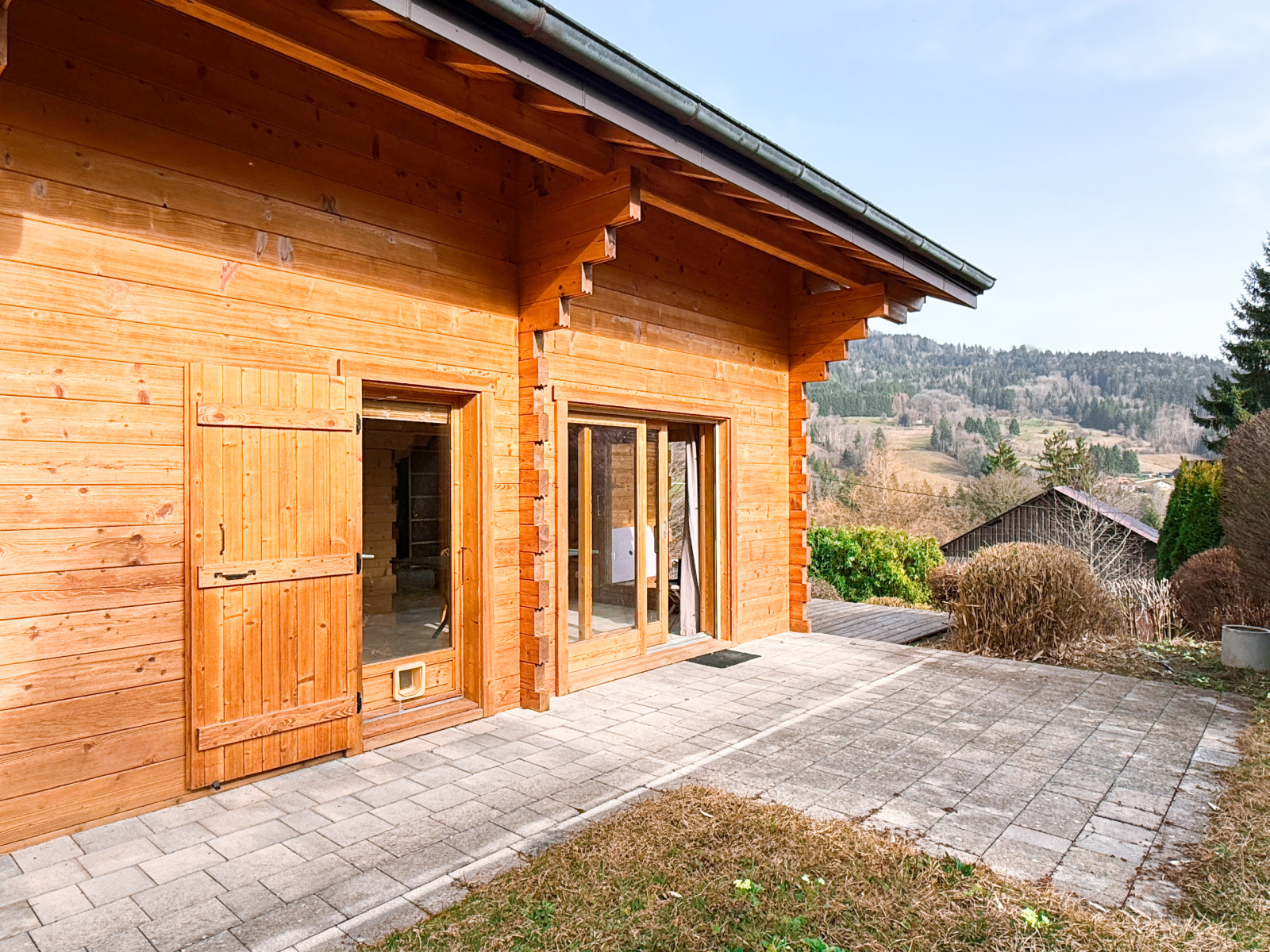 Entre Boëge et Saxel, dans un environnement calme et agréable, charmant chalet meublé de 4 pièces d'une surface de 111 m2 composé comme suit :
