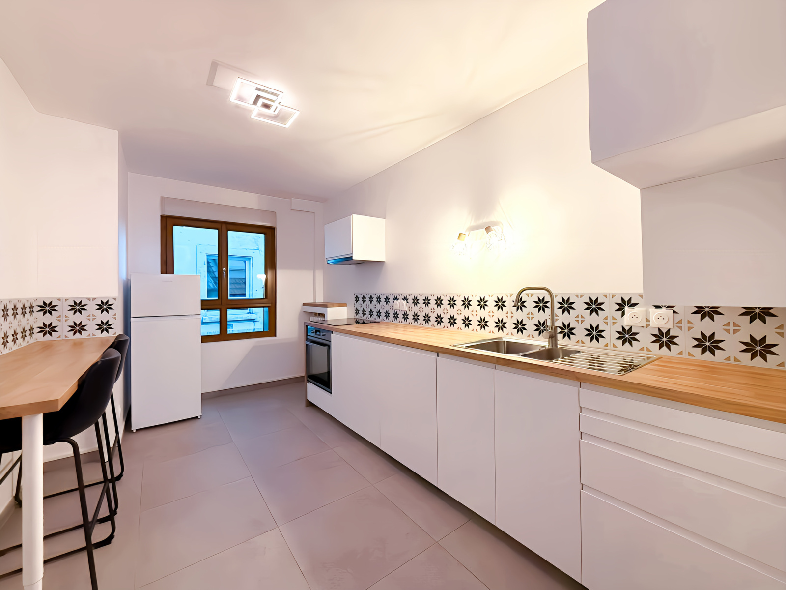- une cuisine équipée : plaque de cuisson, hotte aspirante, four électrique, réfrigérateur-congélateur, lave-vaisselle