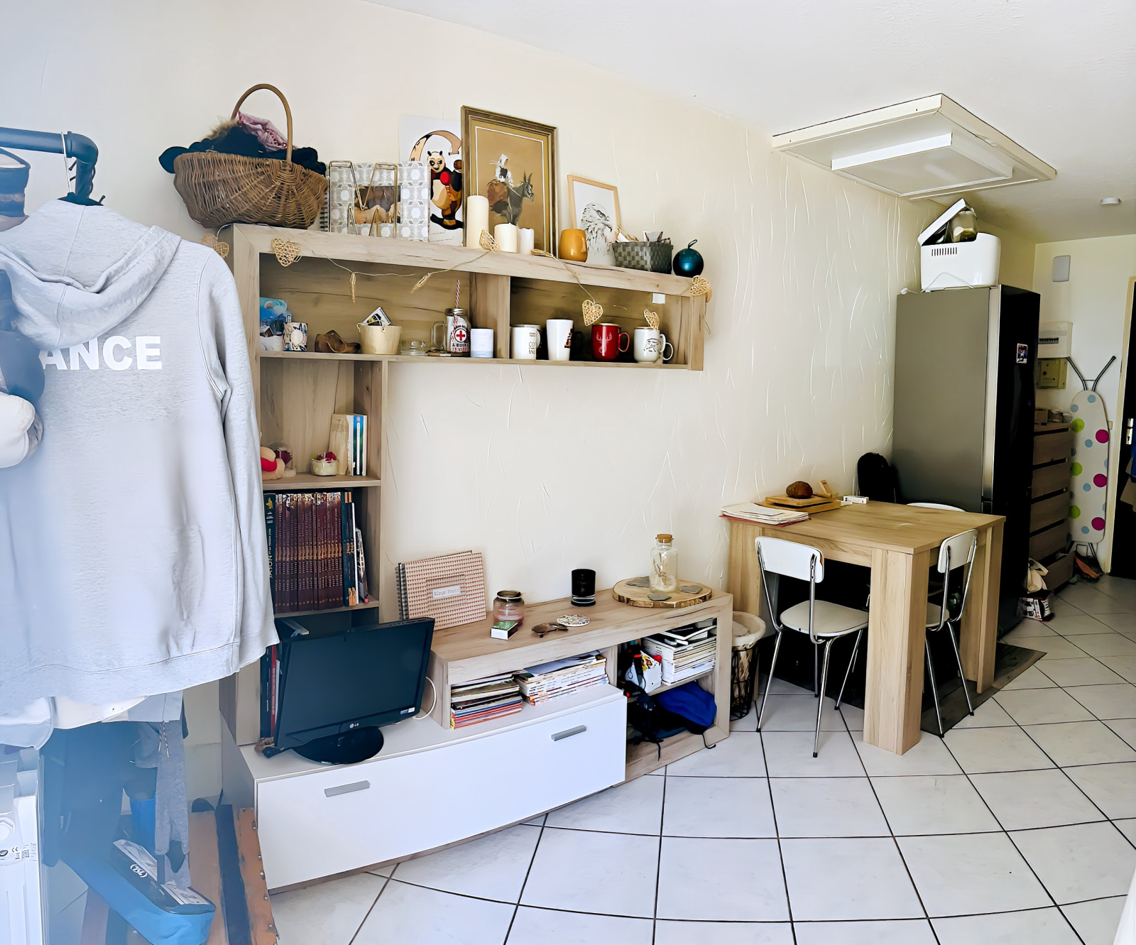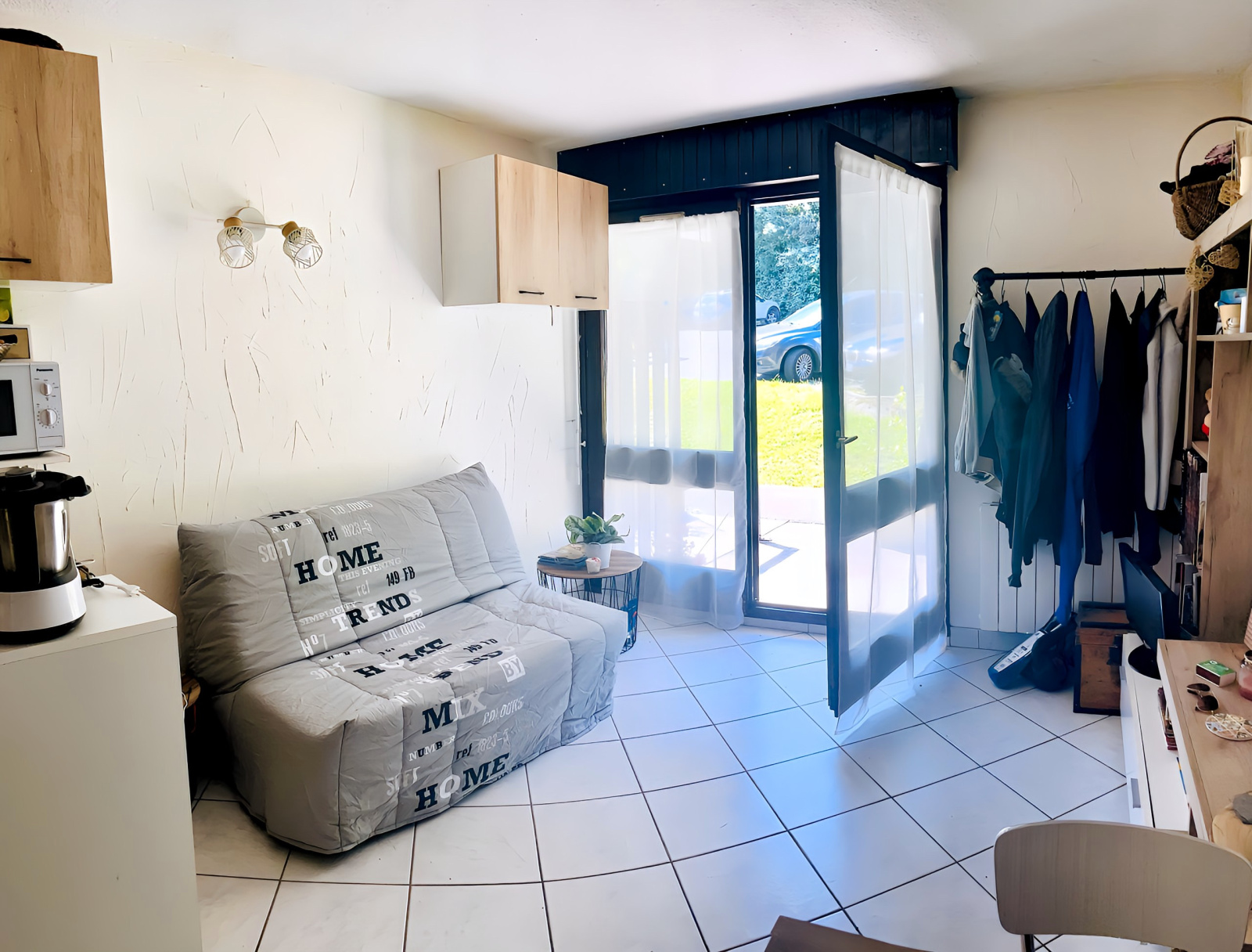 - un séjour : canapé clic-clac très confortable, une table et 3 chaises, un meuble TV et une TV
