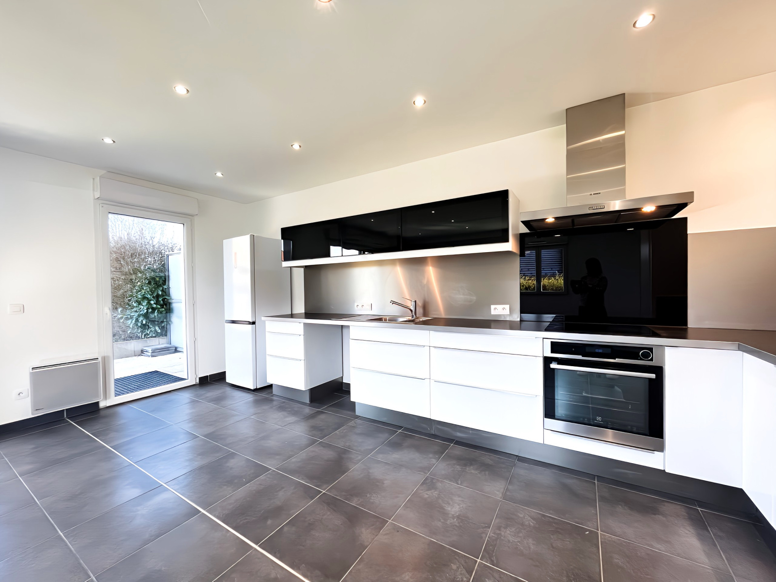 - une cuisine ouverte sur le séjour, entièrement équipée : plaque de cuisson, hotte aspirante, four électrique, réfrigérateur-congélateur
