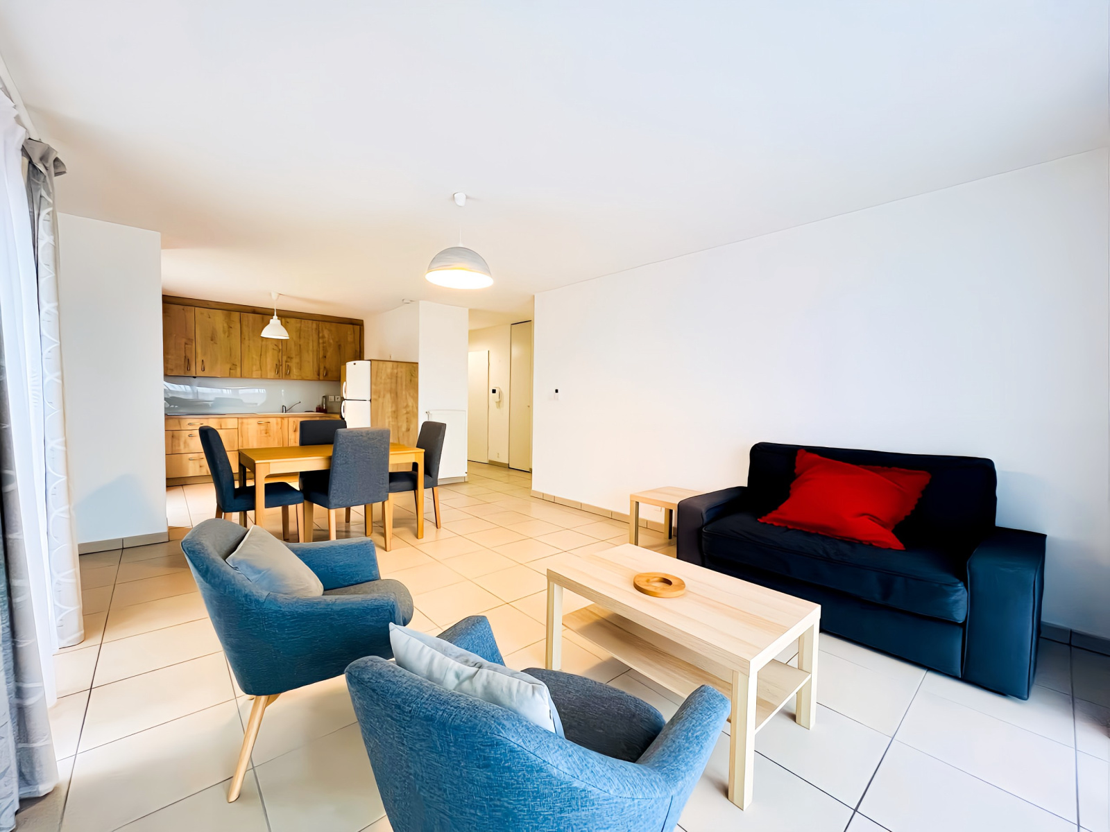 - une cuisine équipée ouverte sur le séjour : plaque de cuisson induction, hotte aspirante, four, lave-vaisselle, réfrigérateur-congélateur