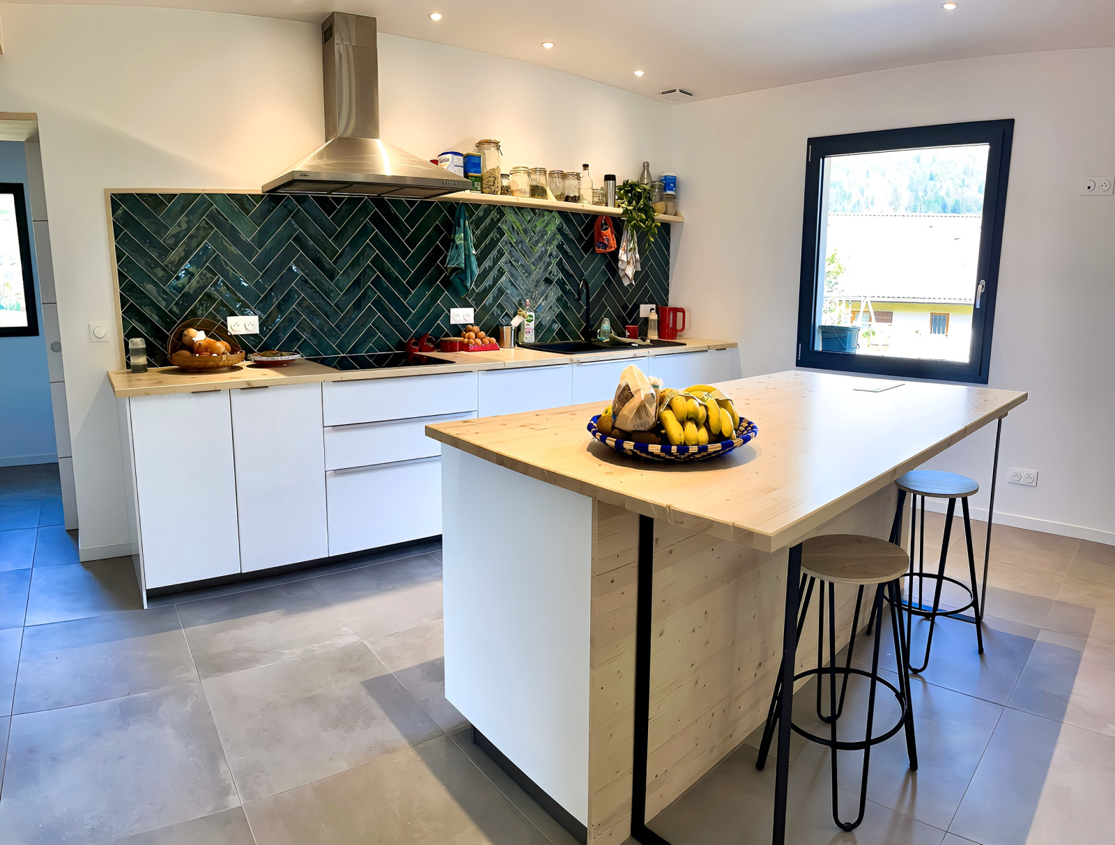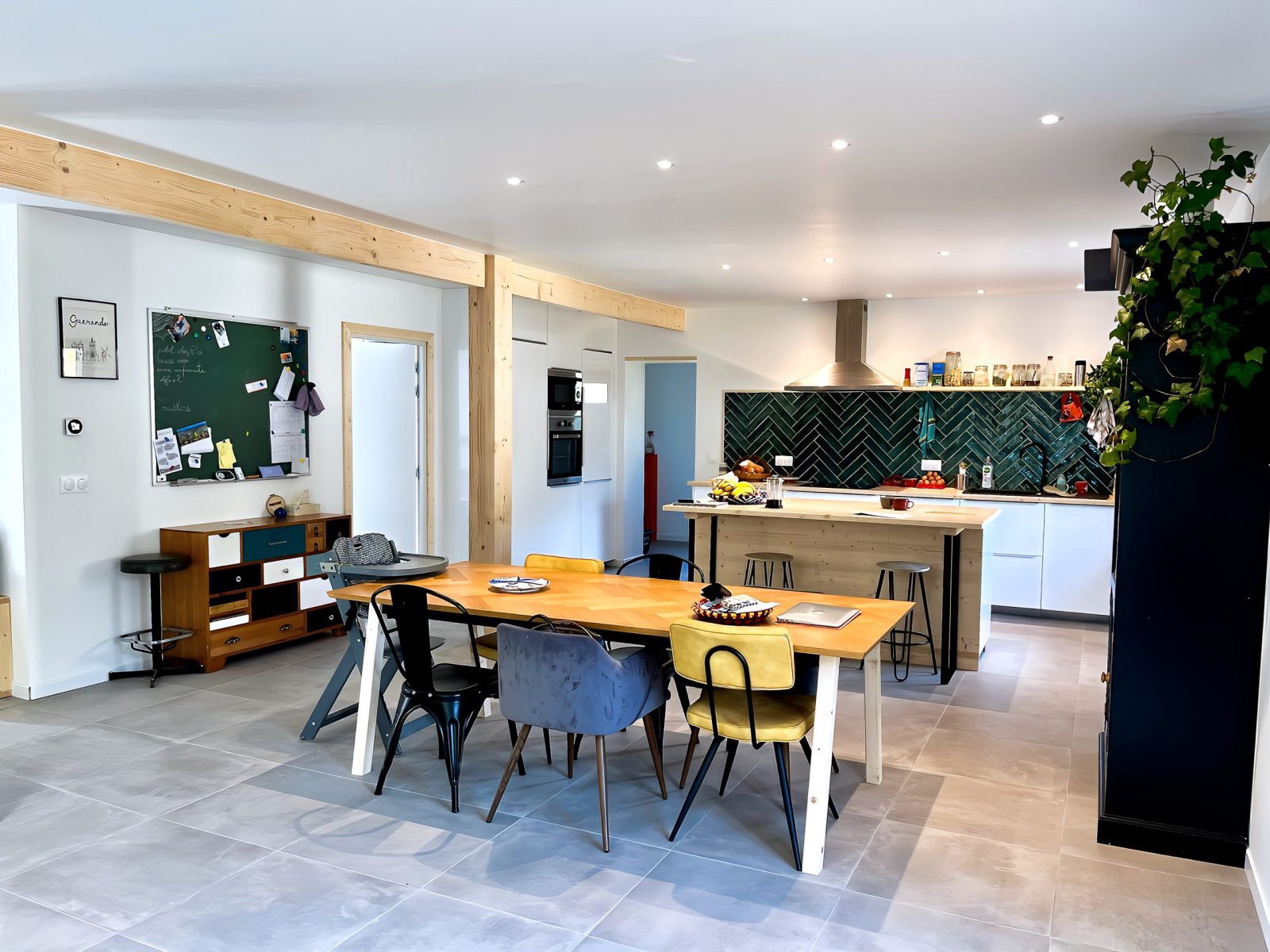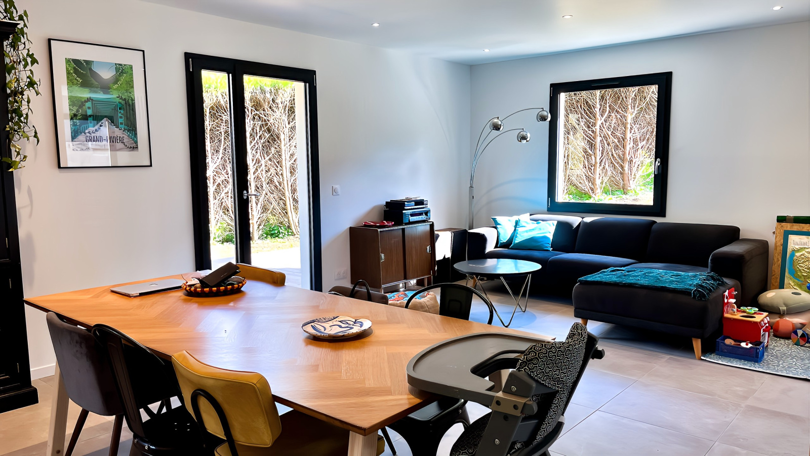 Au rez-de-chaussée : vaste pièce de vie de 64 m2, très lumineuse, avec une cuisine neuve et entièrement équipée ouverte sur le séjour.