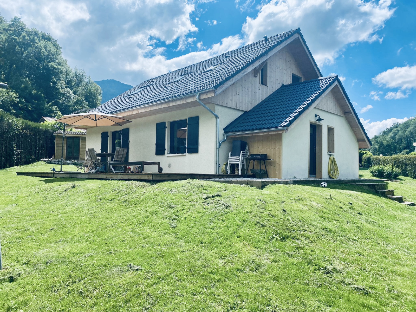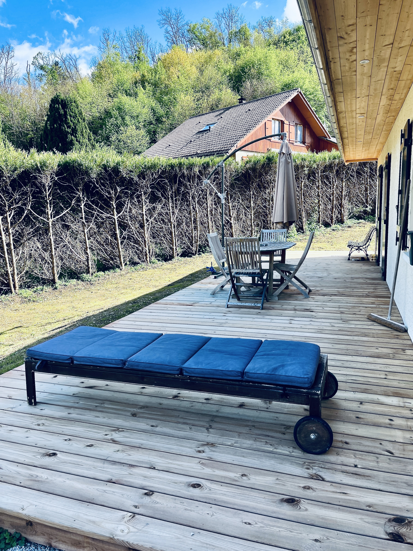 Large terrasse en bois, exposée sud-est.