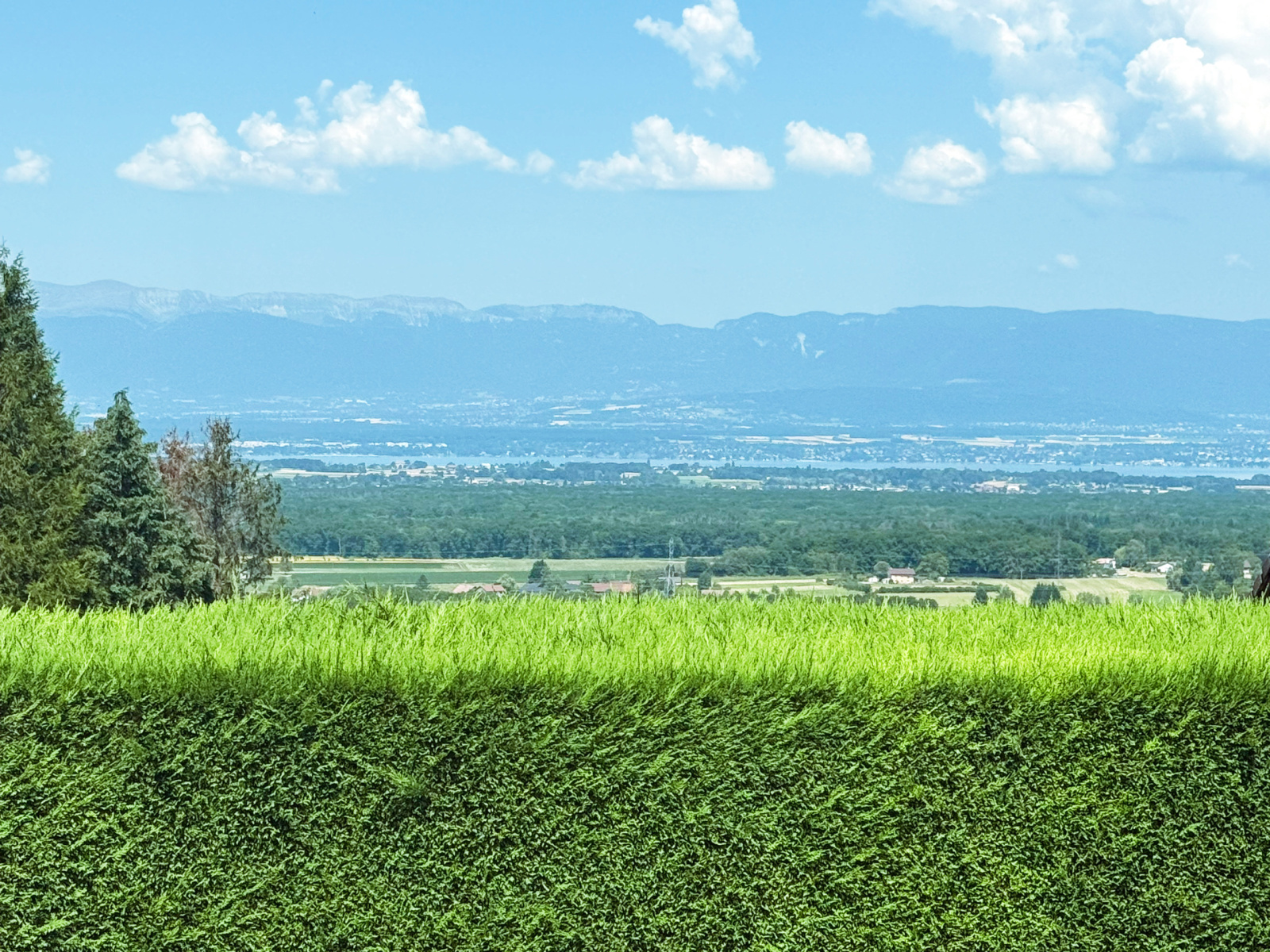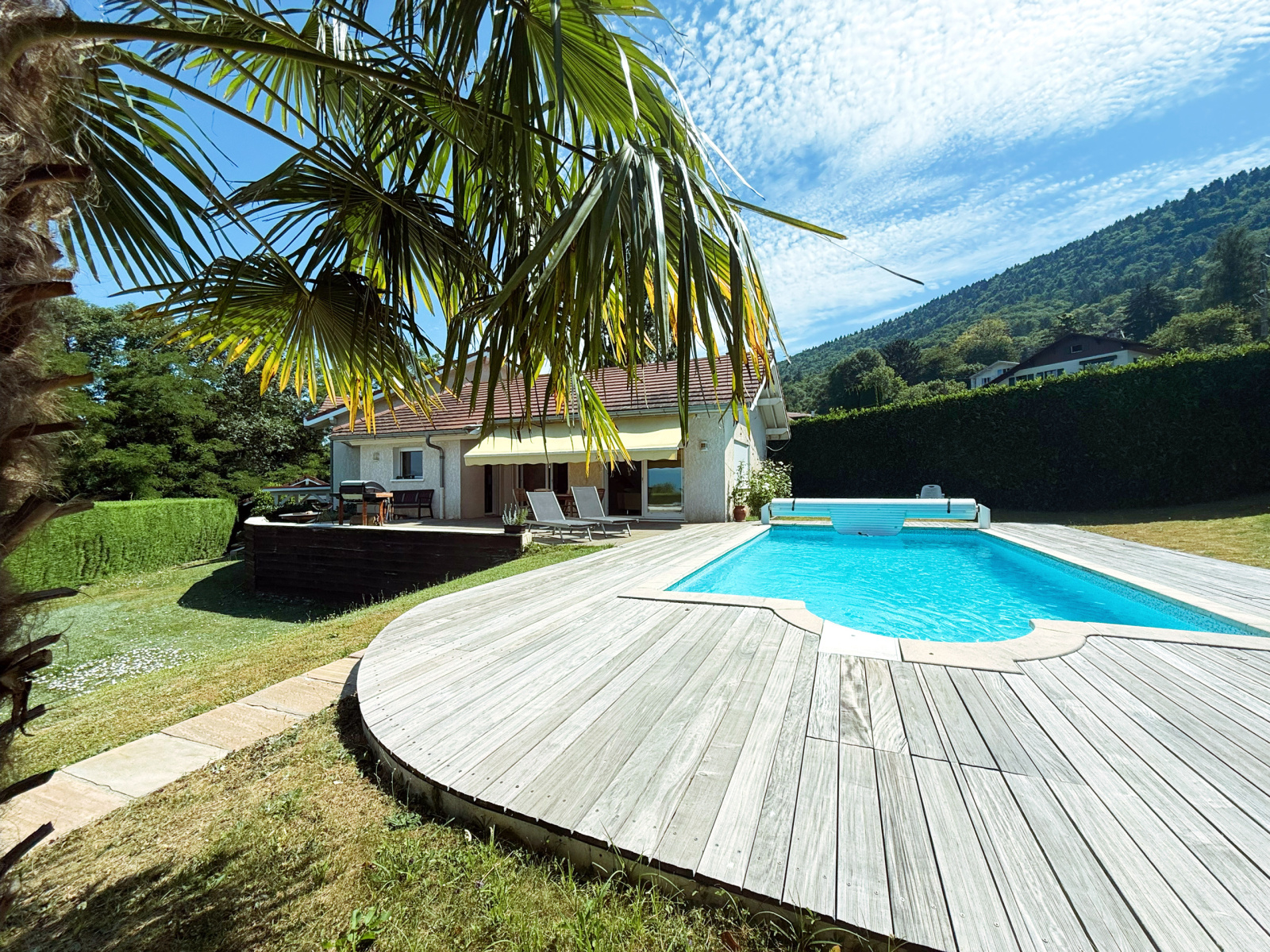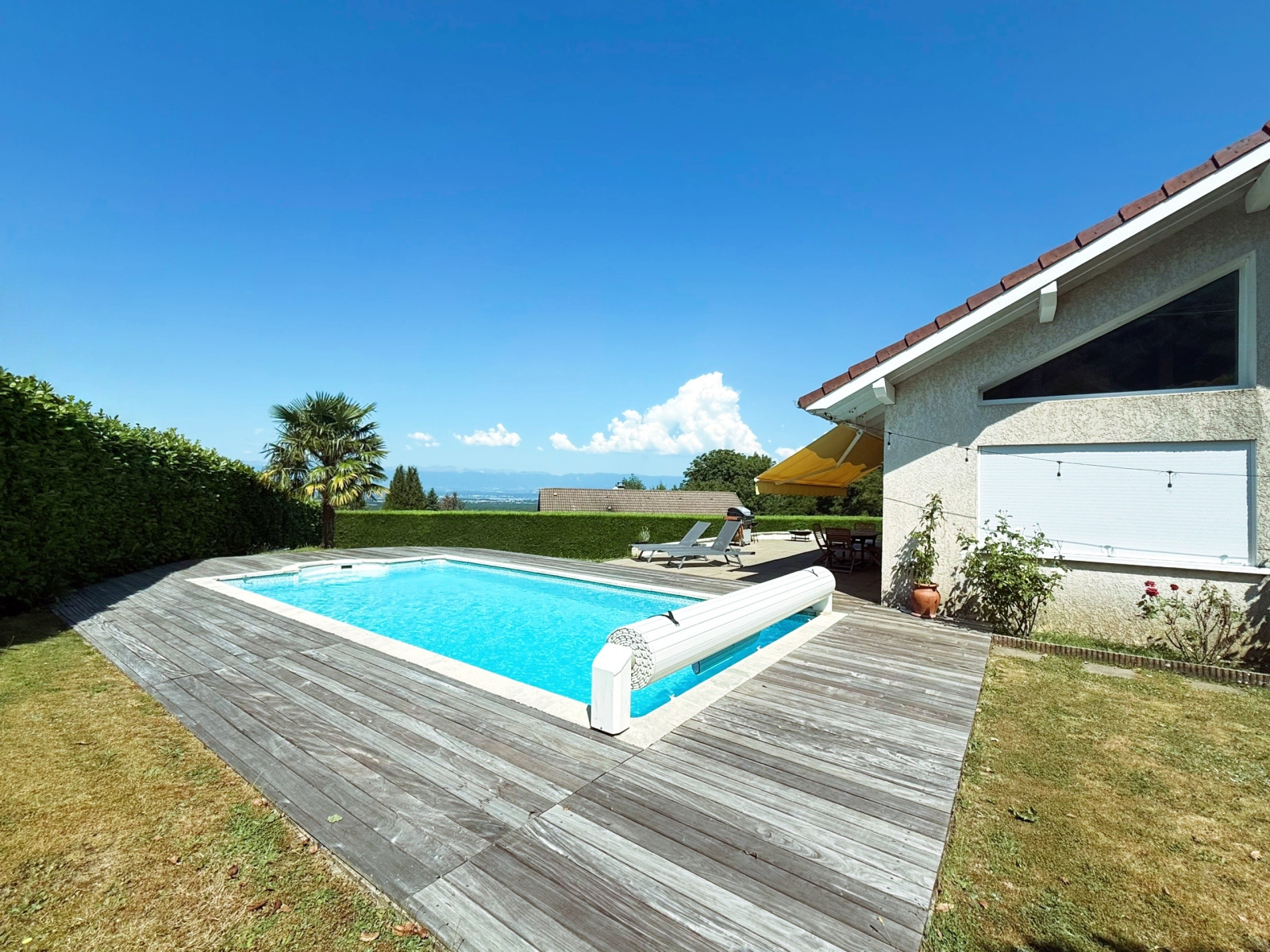 La villa est érigée sur un magnifique terrain d'une superficie de 1 800 m2 disposant d'une terrasse avec vue dégagée sur le lac Léman (jet d'eau) et le Jura ainsi qu'une piscine chauffée.